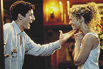 A hallmark of contemporary trash comedies is the dumb flashback. In the middle of a reasonably normal conversation, a character reveals some formative incident from their past. The art of such sequences is in not only going to the high point of outrageousness – usually accompanied by syrupy, sentimental music and a tragic voice-over narration – but also managing to pick some storytelling genre so outdated it is quaintly charming. In Evil Woman – a rather puzzling replacement title for the Australian release of Saving Silverman – Sandy (Amanda Detmer) tells a wonderful story about why she has given up on love. This tragic tale begins with aerial acrobats in a circus (possibly a parody of Wim Wenders' Wings of Desire [1987]) and ends, about two minutes later, with Sandy's determination to become a nun. The flashbacks, which just keep on coming, are the best thing in this film. But the central plot also has an intriguing premise. Two mates, Wayne (Steve Zahn) and JD (Jack Black) are all shook up when their comrade in grotty, male dagdom, Darren (Jason Biggs), starts going steady with a girl. But Judith (Amanda Peet) is no ordinary girl – she is an evil woman because she is a psychiatrist, a snob and worst of all a control freak. Darren finds himself dominated, down to the most intimate aspects of his lifestyle, by Judith's tastes and edicts. As is often the case, trash cinema here raises, with invigorating unsubtlety, a topic kept taboo in supposedly sophisticated relationship dramas. Most of the story, in an echo of the Bette Midler-Danny DeVito vehicle Ruthless People (1986), involves Wayne and JD's clumsy attempt to kidnap and coerce the hard-as-nails Judith. As their victim is adept not only in psychological manipulation but also martial arts, the lads are in for a great deal of punishment. As trash comedies go, this is fairly mild, with the sweet, innocent romance between Darren and Sandy evening out the grossness. The obligatory repertoire of gags about boners, breasts and bongs reaches only one sublime highpoint, involving the "butt implant" which the accommodating Darren undergoes for Judith's sake. And the nervous flirtation with gay themes that underwrites so many films in this mode is here made disarmingly explicit. Evil Woman is, finally, not much of a movie, but it is undeniably enjoyable. The most pleasant surprise of all is how well the incessant Neil Diamond jokes work – from the guys' tribute band and their private memorabilia museum, to a spirited cameo from the master himself and a final, stadium concert that manages to give every single character some decent closure. MORE Dugan: National Security, Problem Child © Adrian Martin December 2001 |