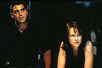 Few action-spectaculars begin as drearily as The Peacemaker. In the murky ruins of a New World Order, trains are hijacked and nuclear weapons are shunted into the evil hands of nameless, faceless villains. Eventually there is a Chernobyl-like disaster and – in a touch that will become characteristic of this movie – we are offered the fleeting glimpse of two ordinary peasants exterminated by these shenanigans. The glamorous American heroes of the piece are, of course, only a mobile-phone-call away. These preservers of world peace make a familiar kind of odd couple. Julia (Nicole Kidman) is a University-trained, cool, collected, slightly officious type. Her partner out in the field, Thomas (George Clooney), is a real-world guy: cheeky, uncompromising, a rebel who gets the dirty work done by whatever means necessary. Julia and Thomas cross the globe at super-fast speed in order to weed out a particularly dangerous terrorist and hopefully save us all from nuclear devastation. To be fair, The Peacemaker is not exactly the standard, gung ho, xenophobic thriller (in the vein of Air Force One [1997]). The guy who eventually slips into America with his deadly device is not a regulation psycho but an individual deeply pained by the war that has destroyed his home and life in Sarajevo. Nevertheless, the film really only flirts with such political complexities and nuances. Steven Spielberg's production company Dreamworks has brought in Mimi Leder (director of episodes of ER and L.A. Law) to handle this slight departure from the action formula. The ambitions of the project are clear. At moments, it recalls the sweeping, political melodramas of the '60s by Hitchcock or Otto Preminger – complete with split-second grabs of overwrought ethnic-sounding music that are meant to create intense empathy for poor, bedevilled, non-American nations. The Peacemaker's political savvy, however, is ultimately as thin on the ground as its grasp of feminism, or its display of general human compassion. In brief vignettes that break up the lumbering action set-pieces, we see our stars shed a tear or look faintly morose in relation to the escalating spectacle of death around them. But this does not alter the key, generic moment when Julia – as a mark of her real-world education – finally learns how to tear through a crowded street and gleefully yell to the operatives who have the bad guy in their rifle sights: "Shoot him!" © Adrian Martin December 1997 |
