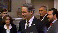 Unbelievably enough, the initial theatrical release of Dave was accompanied by boastful claims that here was a cheeky, satirical, subversive film about American politics – complete with brazen, real-life cameos from key government and news media players. Nothing could be further from the truth, since Dave is a fairy floss fantasy that makes even Frank Capra's Mr Smith Goes to Washington (1939) look like a politically sophisticated tract. The Capra reference is not lost on director Ivan Reitman (Twins [1988]) or writer Gary Ross. Like Jimmy Stewart, Dave (Kevin Kline) is a good-hearted innocent, willing and ready to take the place of a stricken President the moment that government representatives approach him. As the great man's secret look-alike, Dave is suddenly dropped into both the public and private spheres of a none-too-innocent life. When corruption starts to reveal itself, Dave naturally marshals his immense personal integrity and tries to make a difference. Fortunately for Dave, social evil seems to be condensed in a single bad guy, Chief of Staff Bob (Frank Langella), and nation-shaking political decisions are able to be made across a table openly and freely, with TV cameras present. Just like in reality. Actually, it is not a bad film. Reitman has enough skill to keep us from dwelling on the plot's many improbabilities, and enough sense to inject a peculiarly modern note of cynicism into proceedings. He has less success making a fully believable character out of Dave (although Kline's performance is excellent), or creating any vital, romantic spark between Dave and First Lady Ellen (Sigourney Weaver). But Dave is still a diverting and intriguing piece of wishful fiction. MORE Reitman: Father's Day, Ghostbusters II, Six Days, Seven Nights © Adrian Martin May 1994 |