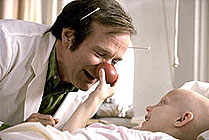 Robin Williams has only two performance modes on screen: manic and depressive. The manic mode is delivered in fits of supposedly hilarious mugging, high-speed improvising and burlesque clowning – the Mork side of the star's persona. The depressive mode (which dominates his more serious roles) is set rigid in glum, mournful facial expressions. It is hard to say which mode is worse. One would think this manic-depressive circuit might render believable the opening of Patch Adams, in which Williams checks himself into a mental institution. But, whether suffering unspecified agonies or tapping mystically into the pain of those around him like in Robert Redford's The Horse Whisperer, Williams is never a credible part of any scene or moment. Narcissistically entranced by the spectacle of his own histrionics, he floats above the film like a hot-air balloon. Patch Adams is the embodiment of everything that people call phony in mainstream Hollywood movies. Although "based on a true story", it is the slickest, most evasive, least real drama on screen at present – built at every moment on handy clichés, stereotypes and approximations. This would not necessarily be a problem if the film were not also so sanctimonious and self-congratulatory. The one curious aspect of this terrible movie is its message, which remains compelling and urgent no matter how thoroughly the filmmakers massacre it. Patch – whose one dream is to become a certified doctor – believes in a highly emotional, life-giving, fun-loving form of treatment. His philosophy is contrasted – with heavy-handed, schematic simplicity – with the hyper-rationalism of medical school. According to the official teachings which Patch does his best to subvert, physical facts are all that matter, objectivity is supreme, and psychological transference is the worst sin of all. The debate between established and alternative medicine touches all our lives. But this film scarcely explores it, either as drama or comedy. Director Tom Shadyac and writer Steve Oedekerk cultivate vagueness on all key points. No illness that Patch encounters is ever named, nor do we see how his idiosyncratic treatment might actually work as an ongoing cure. The ills of traditional medicine are swiftly embodied in a single scapegoat, bad guy Walcott (Bob Gunton). Less central characters fare no better. Patch's classmates (several decades younger than him, of course) strike postures of either disbelief or sympathy as their overgrown colleague yuks it up and delivers tiresome sermons. His girlfriend Carin (Monica Potter) is a relative of the Robin Wright character in Forrest Gump (1994) – touchy, melancholic, dogged by unnamed and unnameable past trauma. It is the kind of film in which, once characters are off-screen, it is easy to forget they ever existed. Williams, unfortunately, is almost never off-screen – and the film depends exclusively on his assumed charisma. At one point, Walcott enters into a report his considered opinion that Patch exhibits "excessive happiness". Everyone in the movie jeers at this line but, watching Williams don yet another red nose and hearing him adopt yet another wacky voice, some viewers may come to sympathise with the old bastard's judgment. MORE Shadyac: Liar Liar, The Nutty Professor MORE Williams: Mrs Doubtfire, Being Human, The Fisher King © Adrian Martin March 1999 |